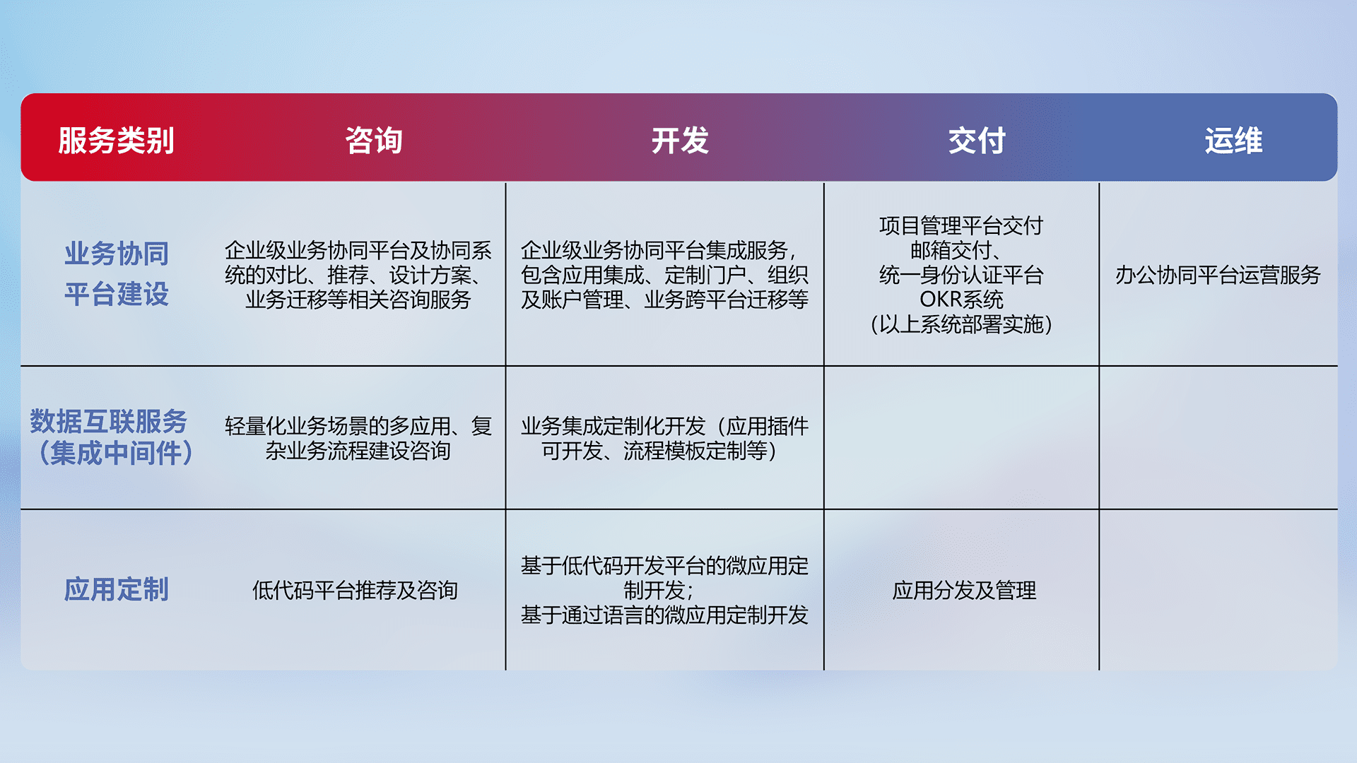 针对钉钉、、、、企微、、IDaas等平台级产品提供产品的规划、、、、方案、、、交付、、、定制化开发等服务,,,,实现如统一协同办公、、、智能客户服务、、、、混合会议管理、、、、智能数据查询、、等业务场景,,,,实现数字化转型。。。。